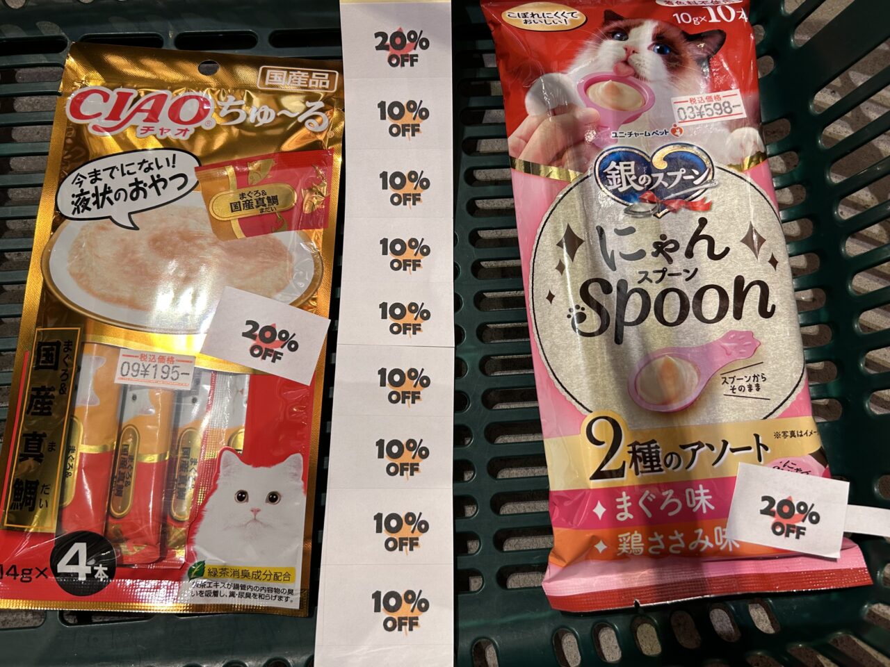 来店時に会員カードを提示すると、20%OFFシール3枚、10%OFFシール8枚がもらえます。好きな商品にシールを貼ることで割引が適用され、フードやおやつ、ペットグッズなどを自分好みにお得に購入できる仕組みです。さらに、店頭にない商品も取り寄せ可能とのこと。