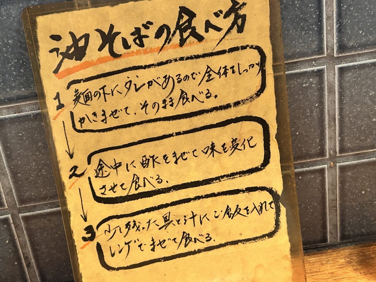 この日は「油そば」を注文。まずは丼の底にあるタレをしっかりと混ぜ合わせ、一口。濃厚で香ばしい醤油ダレが太めのちぢれ麺に絡み、口いっぱいに旨みが広がります。途中で酢を加えると、まろやかさの中にキレが生まれて味の変化も楽しめます。