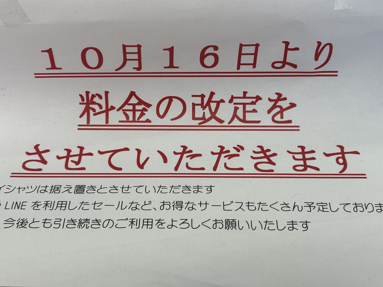 近鉄針中野駅そばの「クリーニング SMILE-MAX」で、2025年10月16日(日)から料金改定が実施されます。掲示によると、Yシャツの料金を据え置きながら、その他のメニューについては一部価格が見直されるとのこと。物価や光熱費の上昇を受けつつも、利用しやすい価格を維持する努力が感じられます。
