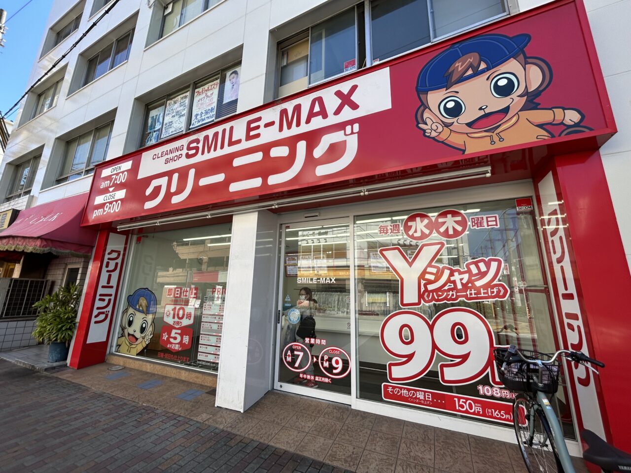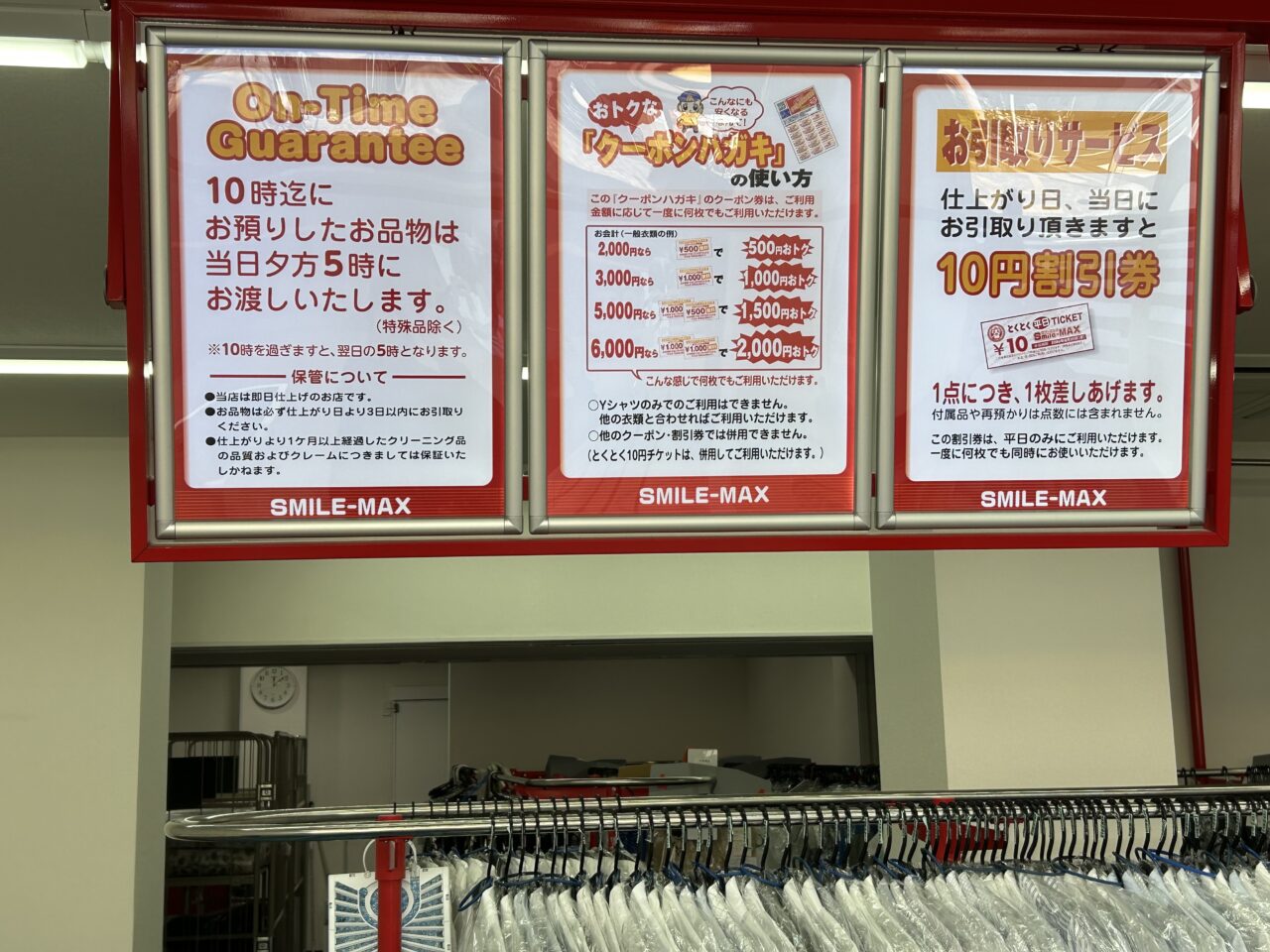 また、LINEを利用したセールなど新しいお得情報も準備中とのこと。清潔感ある赤白の店舗とかわいいマスコットキャラが目印のSMILE-MAXは、通勤・通学途中に立ち寄れる便利な立地。衣替えシーズンの今、改定後のサービスも注目です。