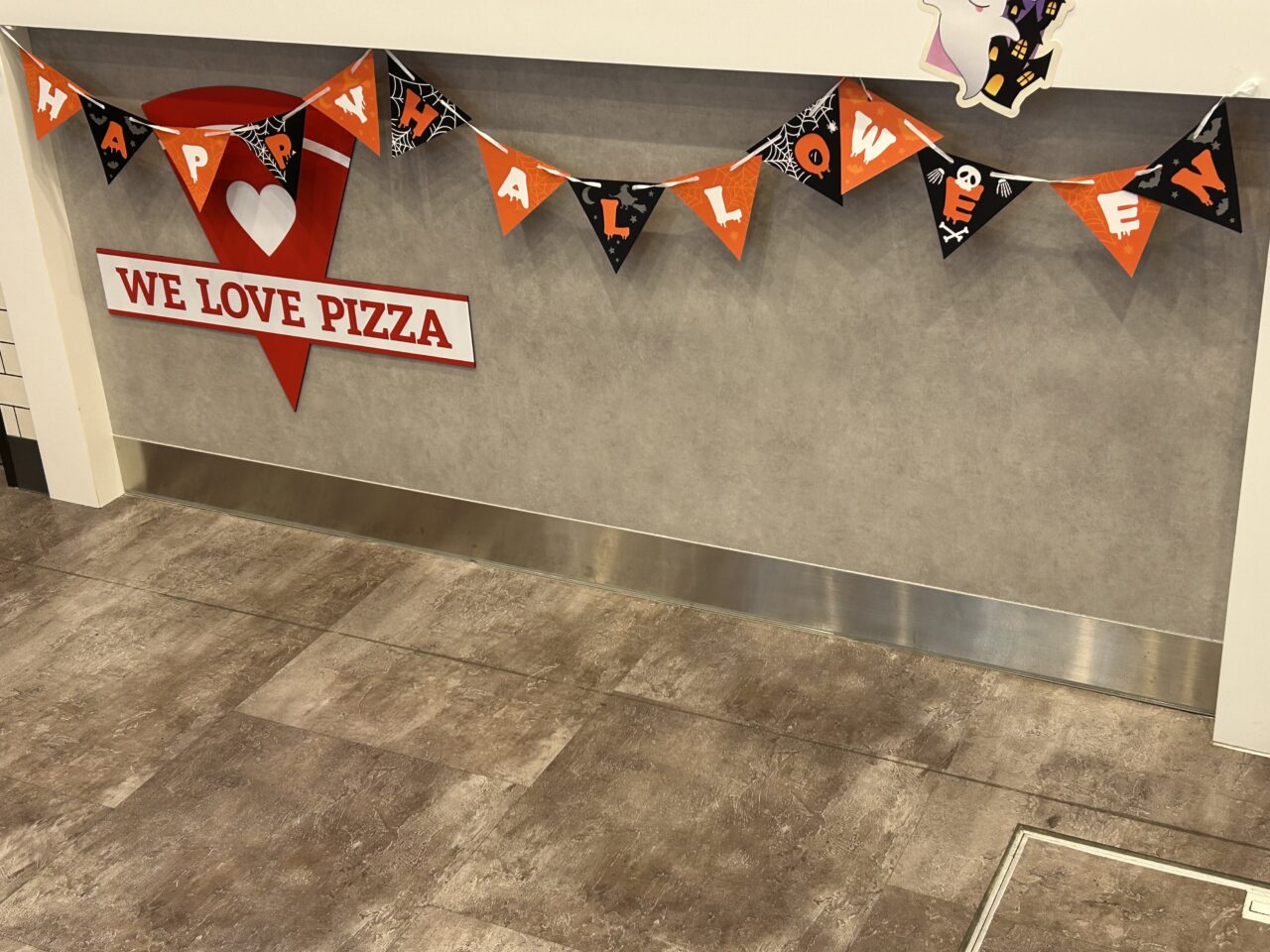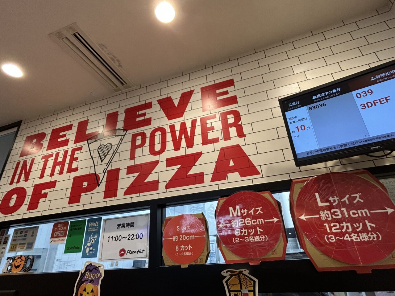 白と赤を基調とした店内は明るく清潔感があり、壁には「BELIEVE IN THE POWER OF PIZZA」のメッセージが映えるおしゃれな空間。ハロウィンのデコレーションも施されており、思わず写真を撮りたくなる可愛さです。