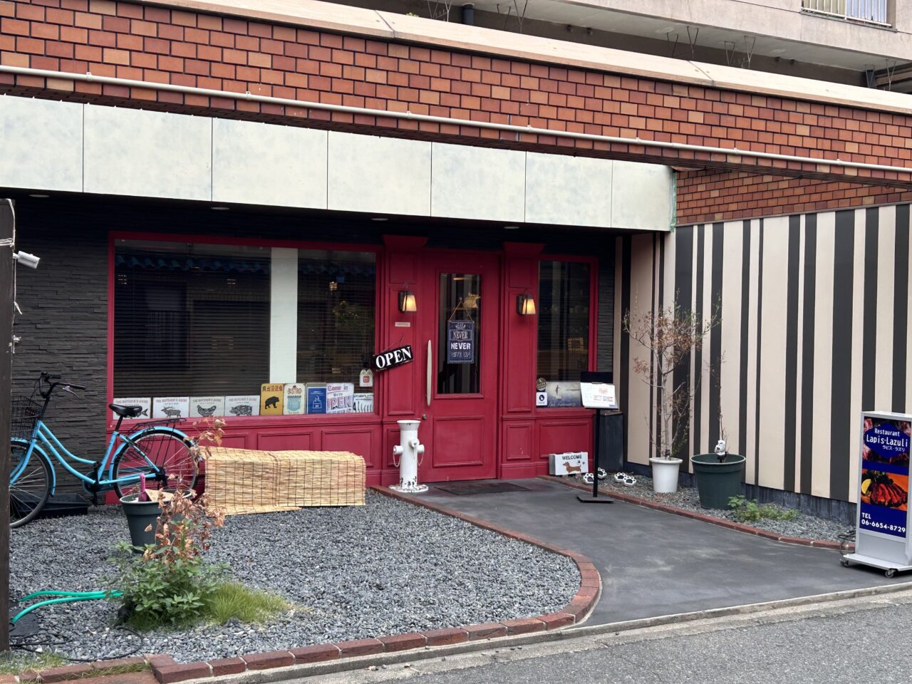 長居の住宅街にある「レストラン ラピスラズリ」は、真っ赤な扉が目を引く隠れ家的レストラン。外観の可愛らしさだけでなく、店内もカラフルで遊び心たっぷり。壁には映画ポスターやアートプレートが飾られ、アメリカンレトロな雰囲気に包まれています。