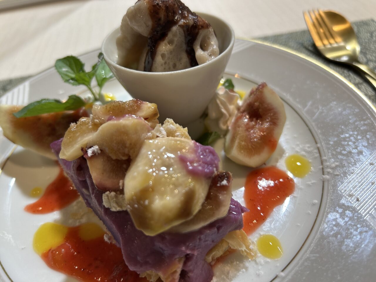 デザートには、いちじくと紫芋クリームのタルトが登場。サクサクのパイ生地とフルーツの甘酸っぱさが絶妙で、思わず笑顔になるおいしさです。