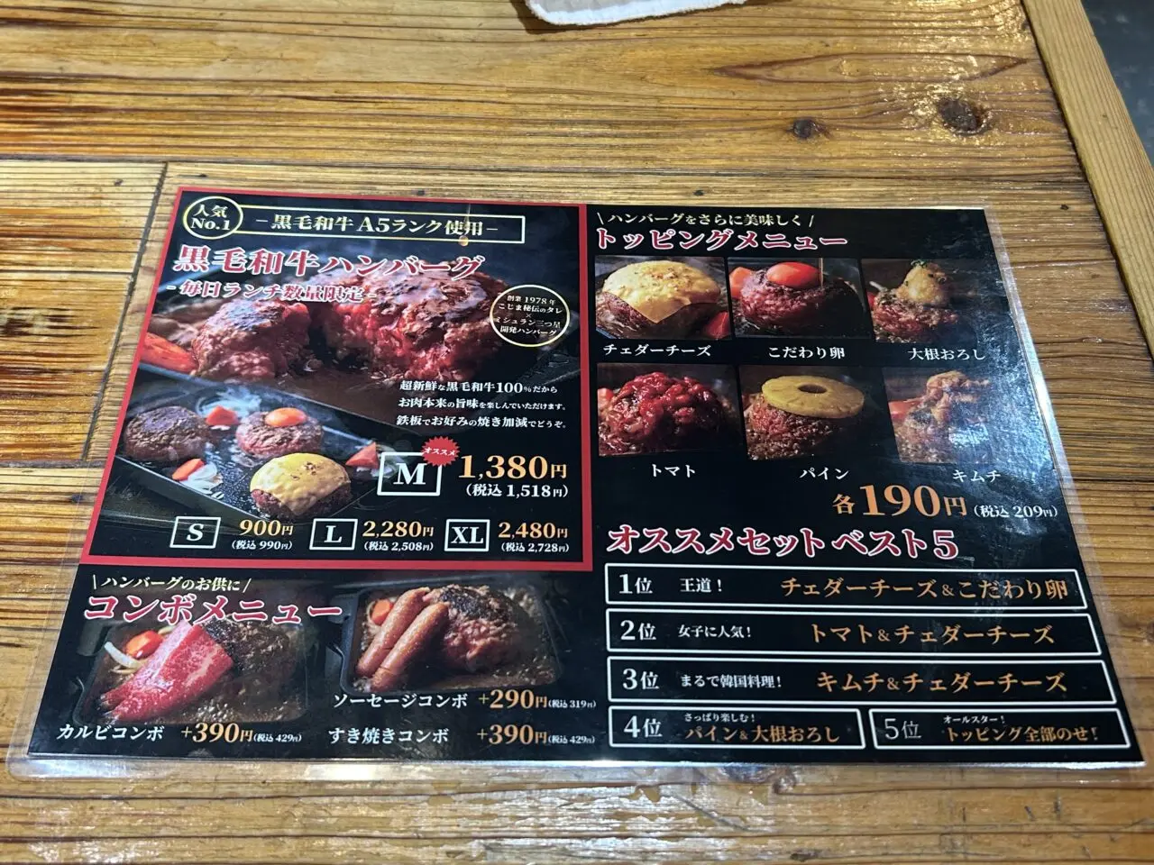 ランチメニューの目玉は「黒毛和牛ハンバーグ」。A5ランク黒毛和牛100%使用の贅沢な一品で、注文ごとに鉄板で焼き上げられるスタイルです。