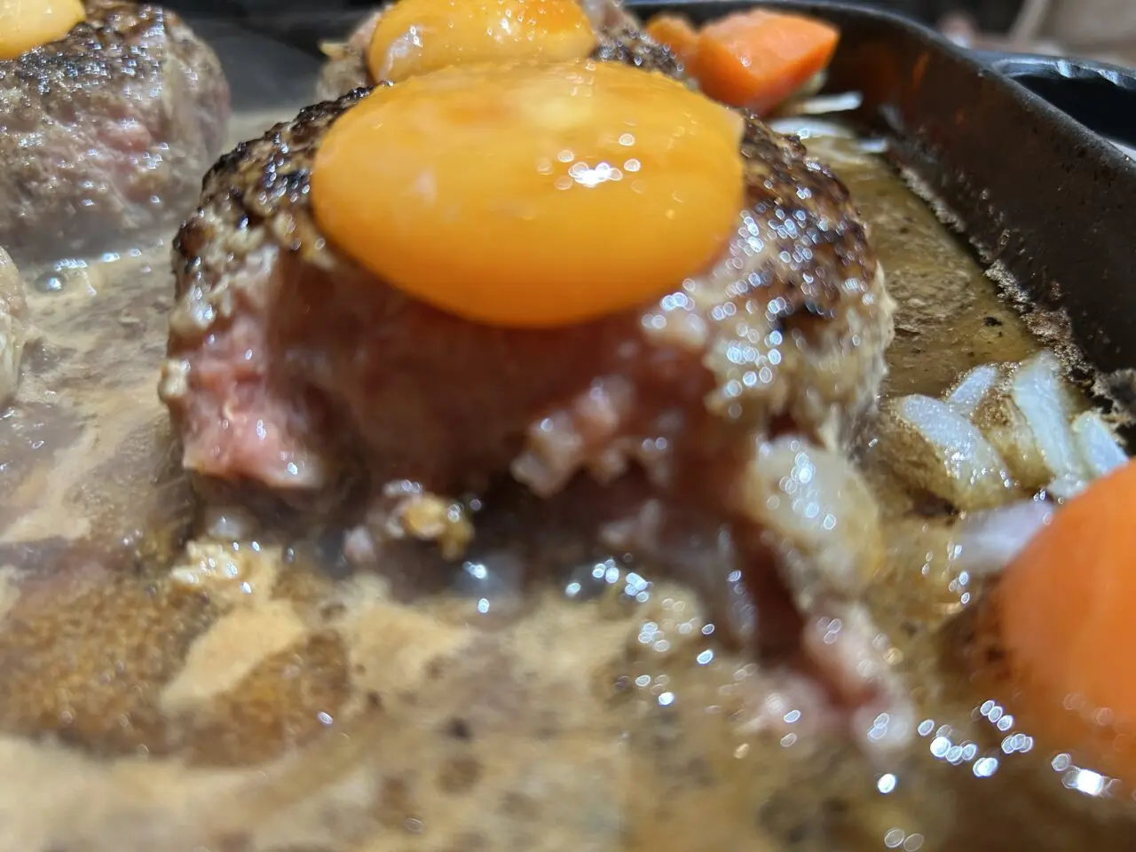 運ばれてきたハンバーグは、肉厚で存在感たっぷり。中央には艶やかな卵黄がのっており、割るとジュワッと肉汁があふれ出します。噛むほどに感じる黒毛和牛の甘みと旨味、そして香ばしい焼き目が絶妙。ごはんとの相性も抜群で、あっという間に完食してしまうおいしさでした。