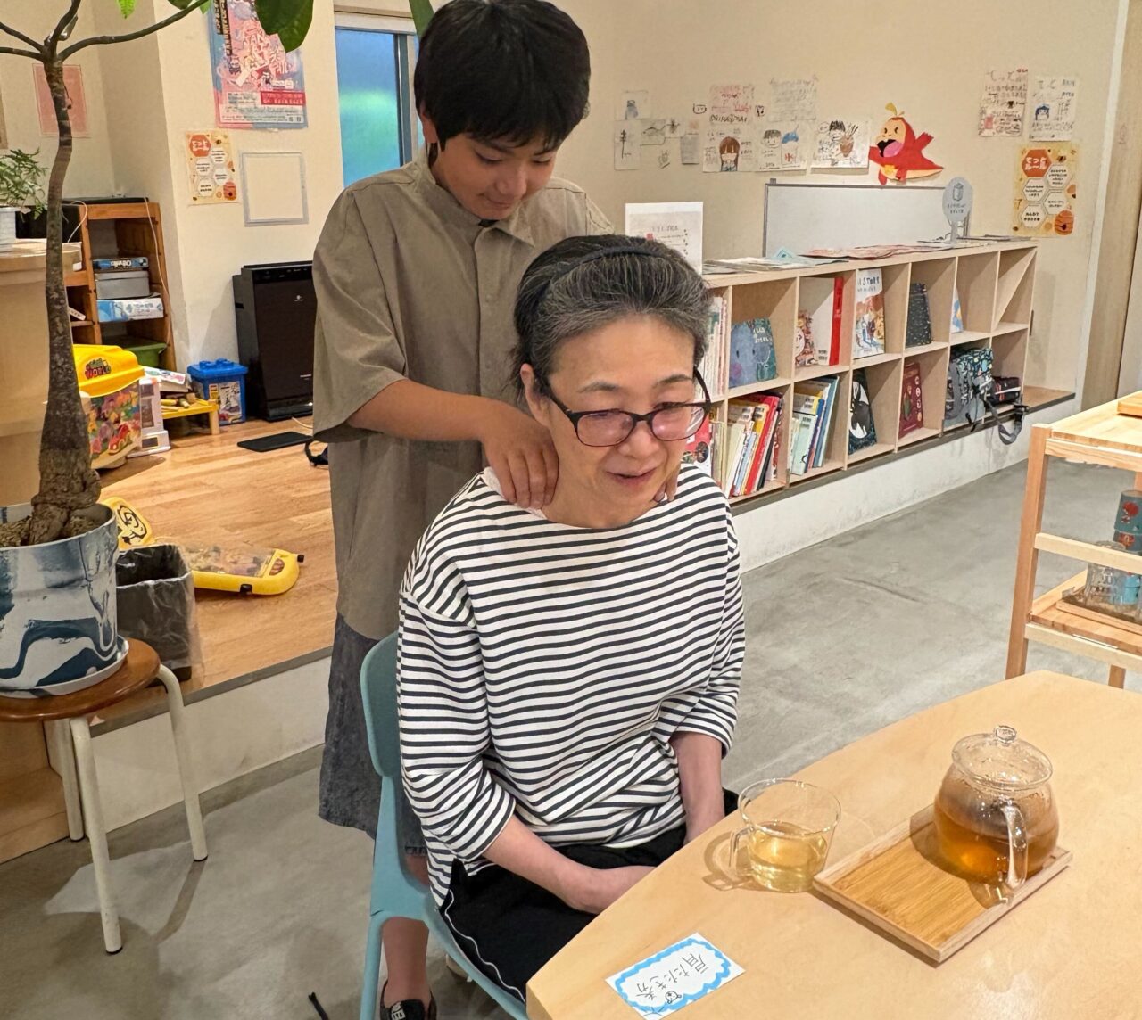 対象メニューを注文すると、かわいい手描きの「肩たたき券」がついてきて、子どもが優しく肩をトントン。くすっと笑える温かい時間が流れ、店内の空気もゆるやかに。肩たたきを終えると、子ども達は報酬として“駄菓子コーナー”で好きなお菓子を選べます。