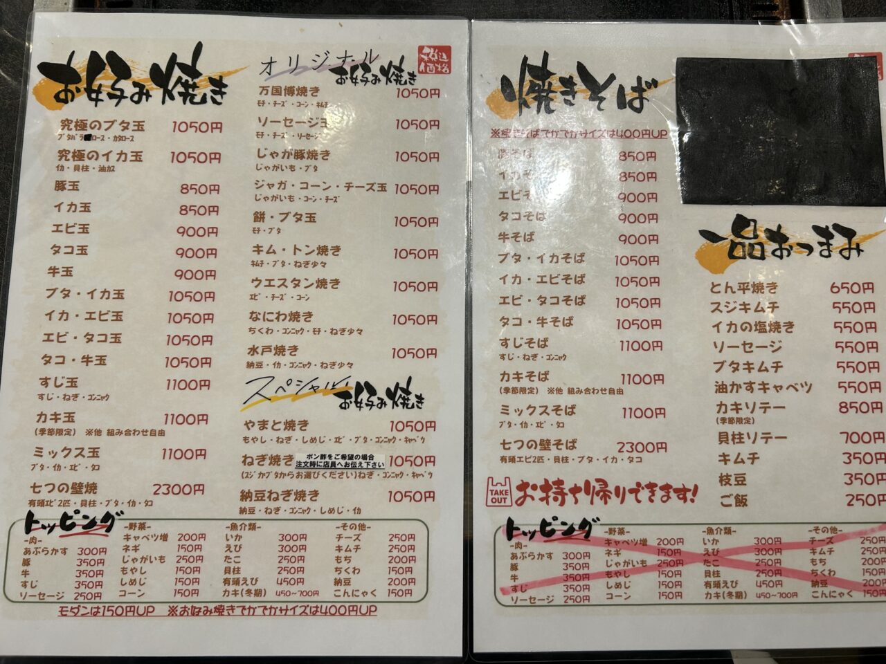 メニュー表を見ると、定番のブタ玉やイカ玉はもちろん、牛玉・タコ玉・エビ玉など種類がとにかく豊富。人気の“究極のブタ玉”や“七つの壁焼き”といった特別メニューも並び、何度訪れても飽きないラインナップです。お好み焼きはふわっと軽い生地にソースがしっかり絡み、鉄板で自分好みに焼き上げられるのも魅力。マヨネーズをたっぷりかければ、香ばしさがさらに引き立ちます。