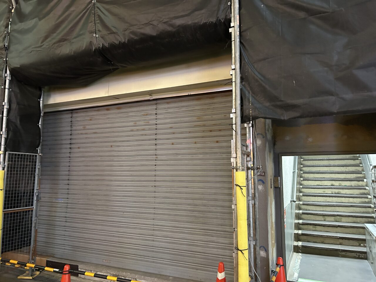 2025年12月4日(木)現在、内装工事が本格的に始まっていることがわかりました。現地はシャッターが下り、周囲には黒い養生シートや足場が設置され、店舗内では何かしらの新しい準備が進んでいる様子がうかがえます。