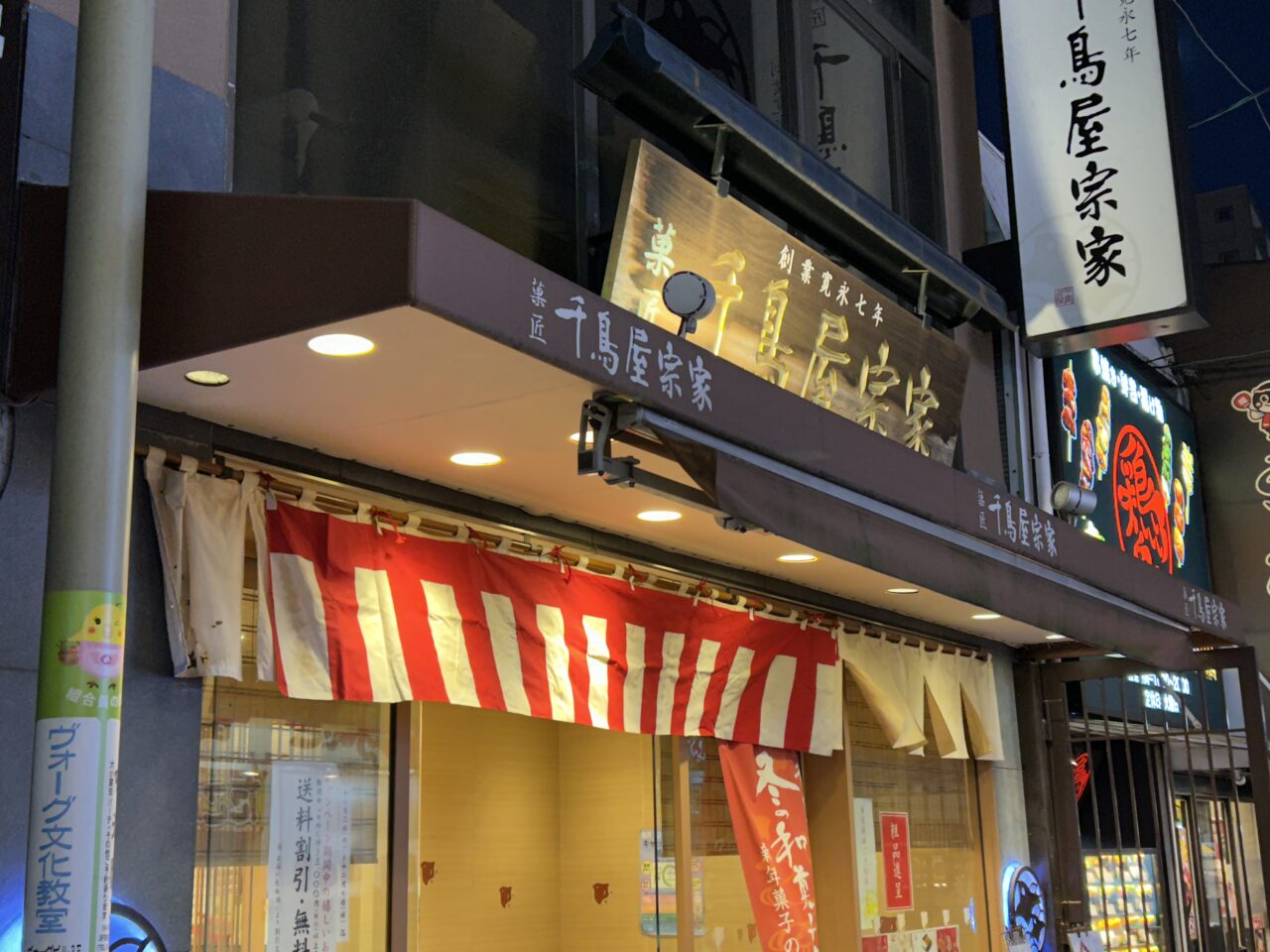 この場所は、商店街の中でも人通りが多く、向かいにはコメダ珈琲店、周辺には飲食店や老舗の和菓子店「千鳥屋宗家」、サーティワンアイスクリームなどが立ち並ぶエリア。近隣の照明看板が明るく灯るなか、この一角だけ工事のため閉ざされており、逆に注目を集めていました。