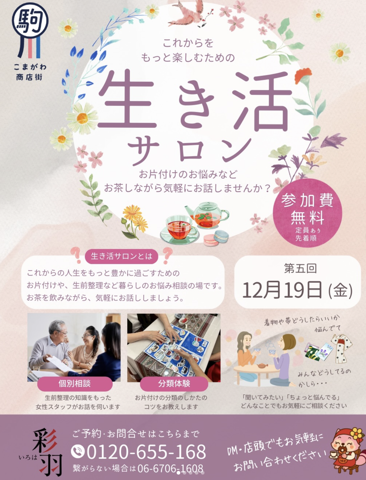 駒川商店街に店舗を構える「買取りの彩羽」では、これからの暮らしをもっと軽やかに過ごすための“生前整理”について学べる「生活サロン」を定期開催しています。次回の第五回サロンは2025年12月19日(金)に実施予定。お片付けに関する悩みや不安を、お茶とお菓子を楽しみながら気軽に相談できる地域参加型の企画です。