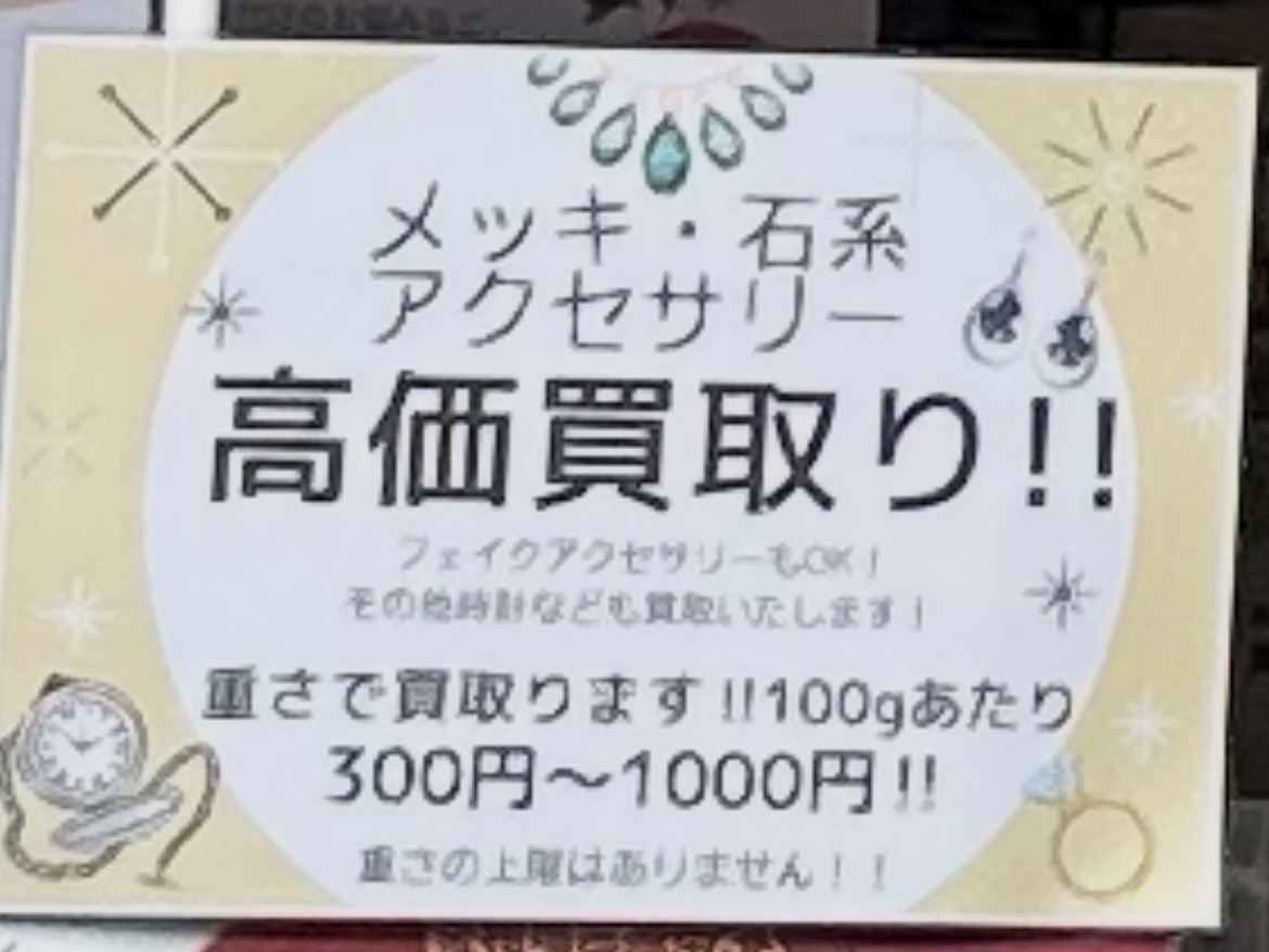 また店頭では、金・プラチナの買取価格を毎日提示しており、メッキや石系アクセサリーも100gあたり300〜1000円で買取るなど、気軽に利用できるサービスが充実。駒川商店街の活性化にも力を入れており、毎月1・6・8・16日は「いろはイベント」、25日は「ニッコリイベント」を開催するなど地域との連携も積極的です。