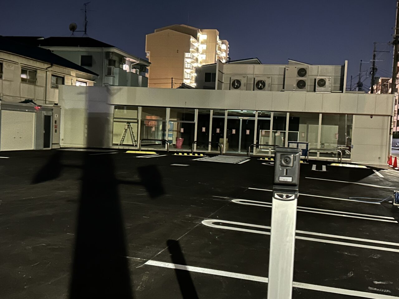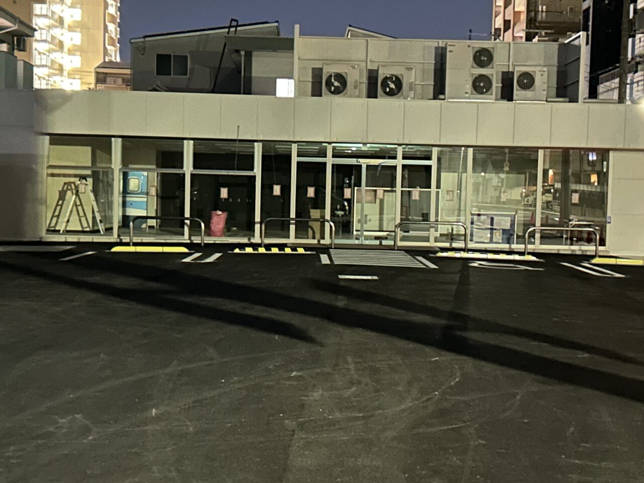 建物は平屋で、横長のガラス張りの外観と広めの駐車場を備えたレイアウト。夜間でも明かりが入り、内部には脚立や資材の姿が見られ、急ピッチで内装工事が行われている様子でした。