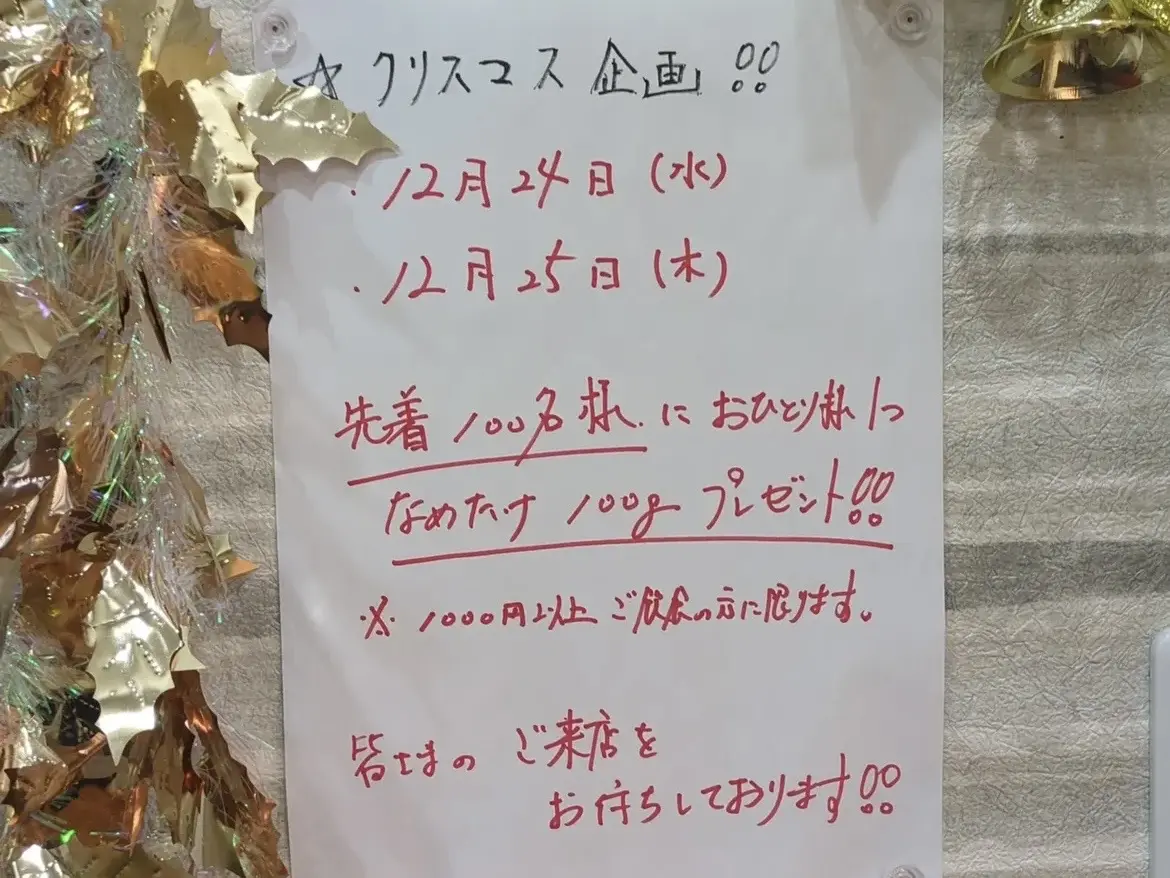 今回の企画は、先着100名限定で「なめたけ100g」をプレゼントというもの。条件は1,000円以上の飲食をした方に限られます。店内掲示のみで告知されている“こっそり企画”という点も、常連さんや気づいた方にはたまらないポイントです。