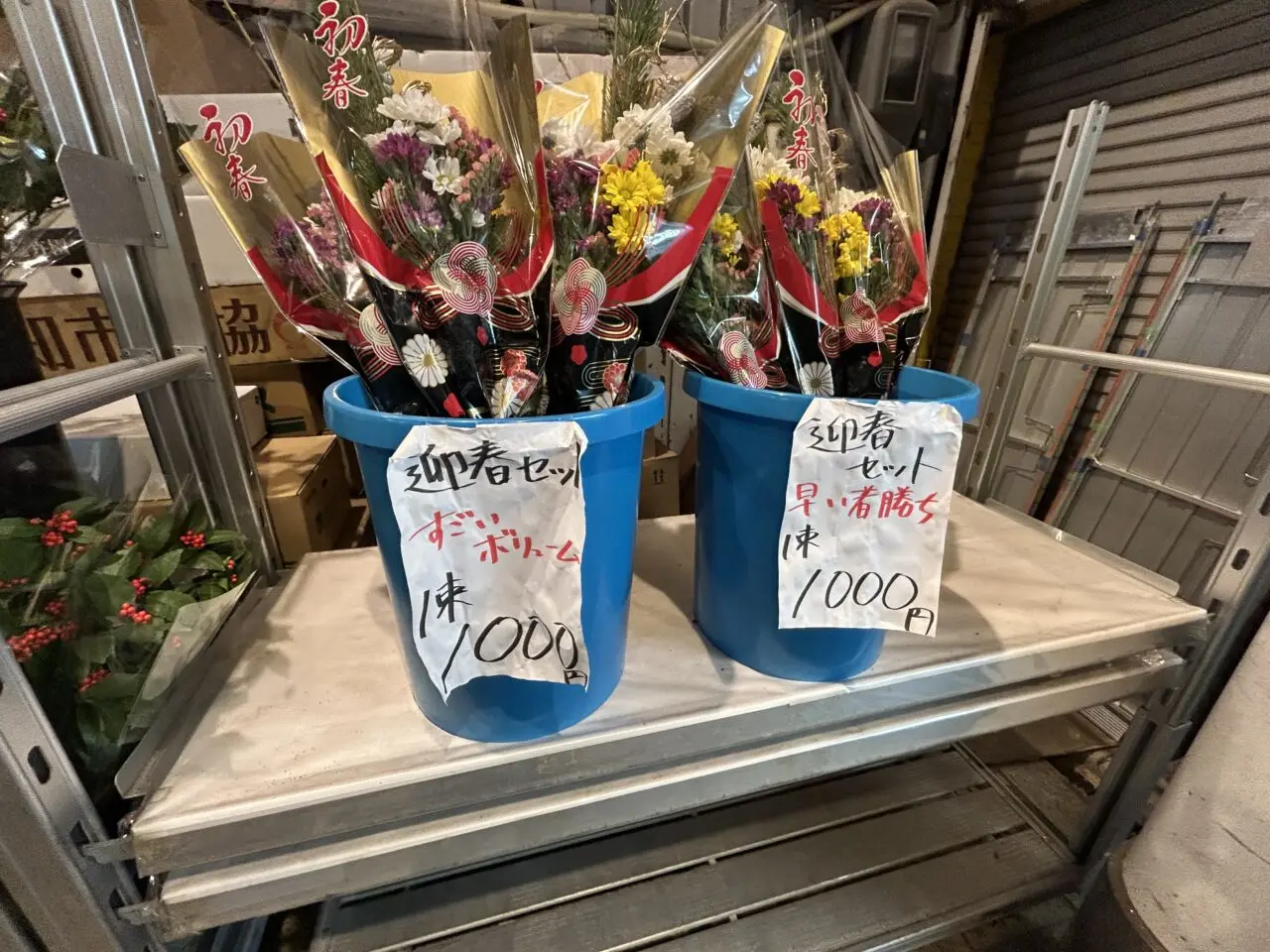 「大特価」と書かれた値札が付いた花束も多く、菊やカーネーション、季節の花が手に取りやすい価格で販売されています。仏花やお正月飾り用のセットも充実しており、年末年始の準備をする人にとって心強い存在だと感じました。
