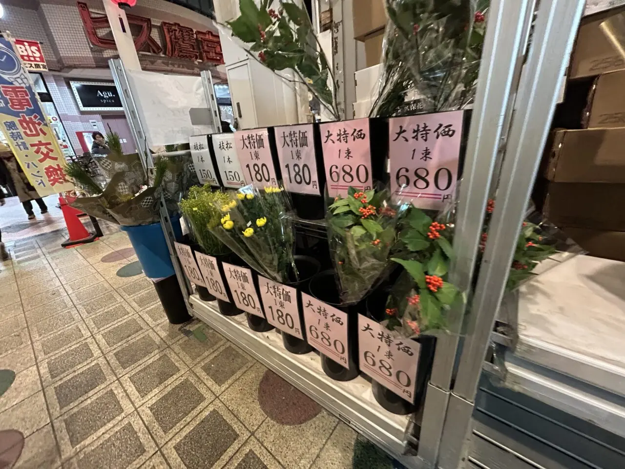 商店街の中という立地もあり、買い物の流れで立ち寄る人や、花を手に足早に帰路につく人の姿が見られました。年の瀬ならではの空気感とともに、花の香りと色彩が商店街の風景をより一層引き立てており、駒川商店街の年末を象徴する光景のひとつとなっていました。