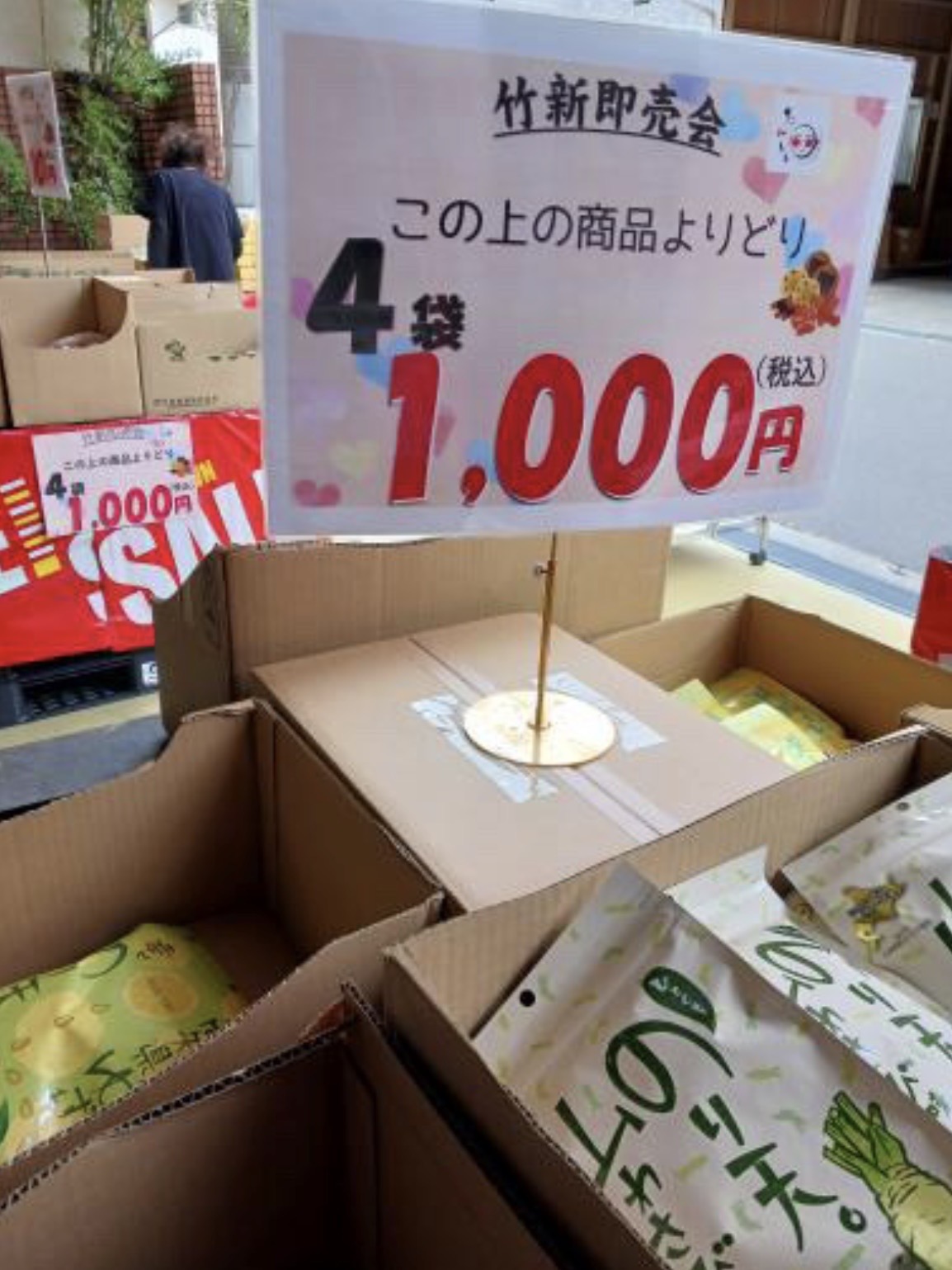 会場には、米菓・ナッツ・おつまみ・えびせんなど、竹新ならではの商品がずらりと並び、よりどり4点1,000円(税込)といったお得なセット販売も予定されています。まとめ買いをする方や、家族・友人へのおすそ分け用に購入する方の姿も多く見られます。