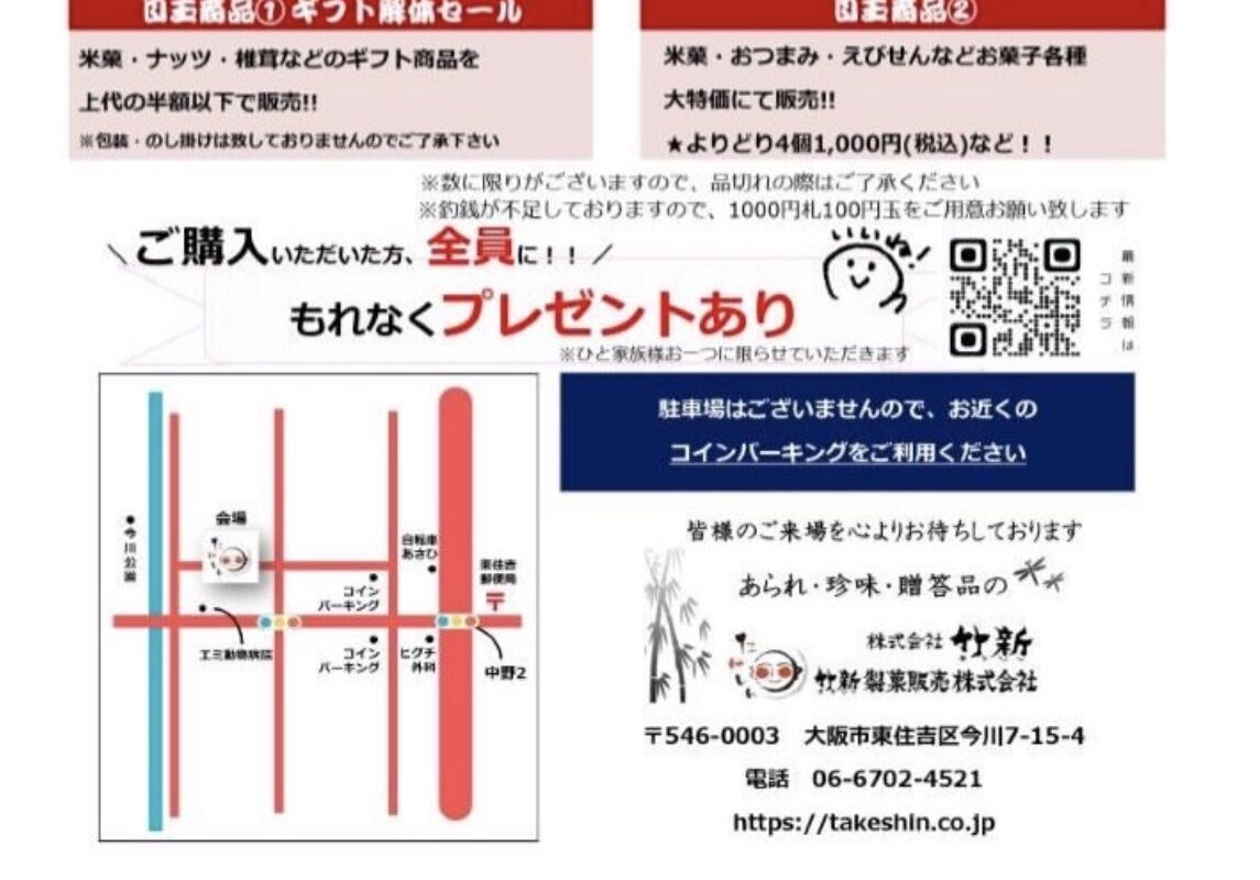 【大阪市東住吉区】40〜60%OFFも!1日限りの大チャンス「竹新の即売会」が2月14日(土)に開催されます