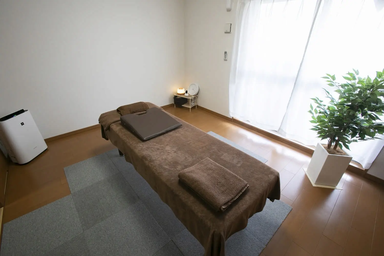 サロンはマンション内にあり、オートロックで安心感のある環境。室内は落ち着いたブラウンを基調とした清潔感あふれる空間で、完全個室のプライベート施術。大きな窓から差し込むやわらかな光や観葉植物、間接照明が心地よい雰囲気を演出しています。