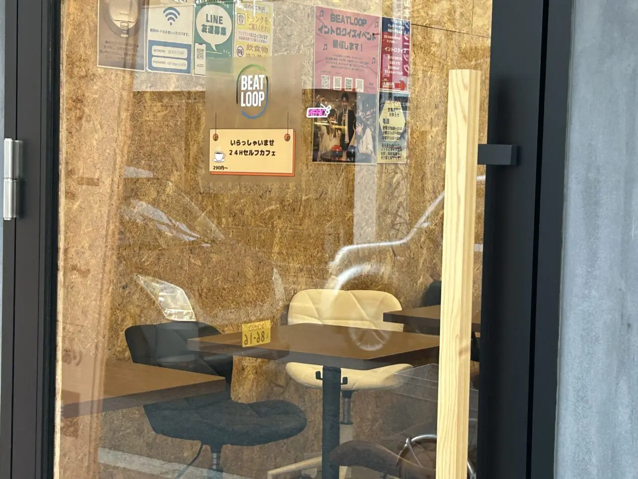 外から店内をのぞくと、木目調の落ち着いた空間にテーブル席が並び、Wi-Fiや電源も利用できる様子でした。入口には料金や利用方法の案内も掲示されており、無人スタイルで気軽に使えるカフェのようです。ちょっとした作業や勉強、待ち時間の利用にも重宝しそうですね。