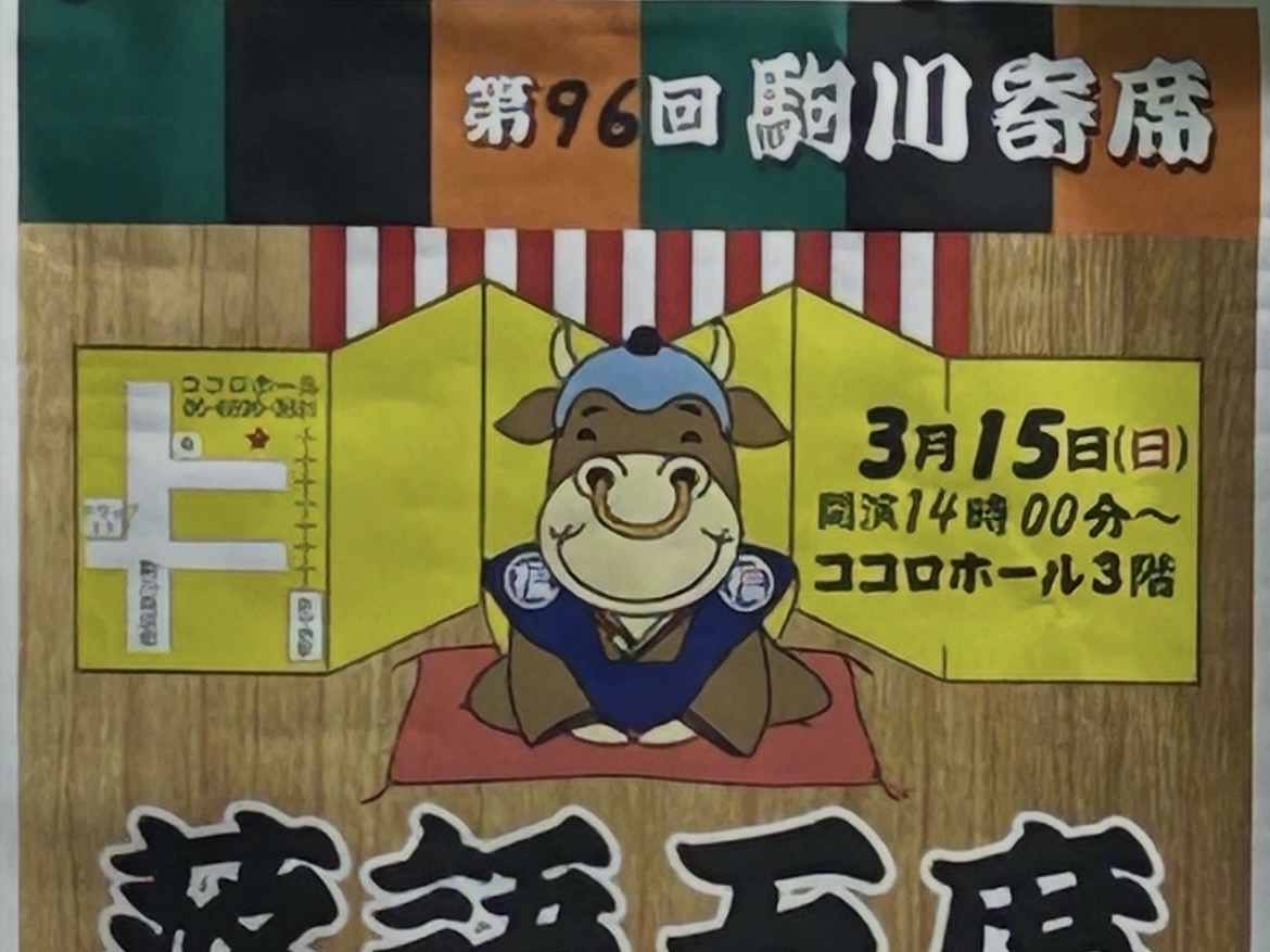 駒川商店街で長年親しまれている恒例イベント「第96回駒川寄席」が開催されます。今回のポスターには、愛らしい牛のイラストが大きく描かれ、どこかほっこりとした雰囲気。地域に根ざした温かみのある寄席らしさが伝わってきます。