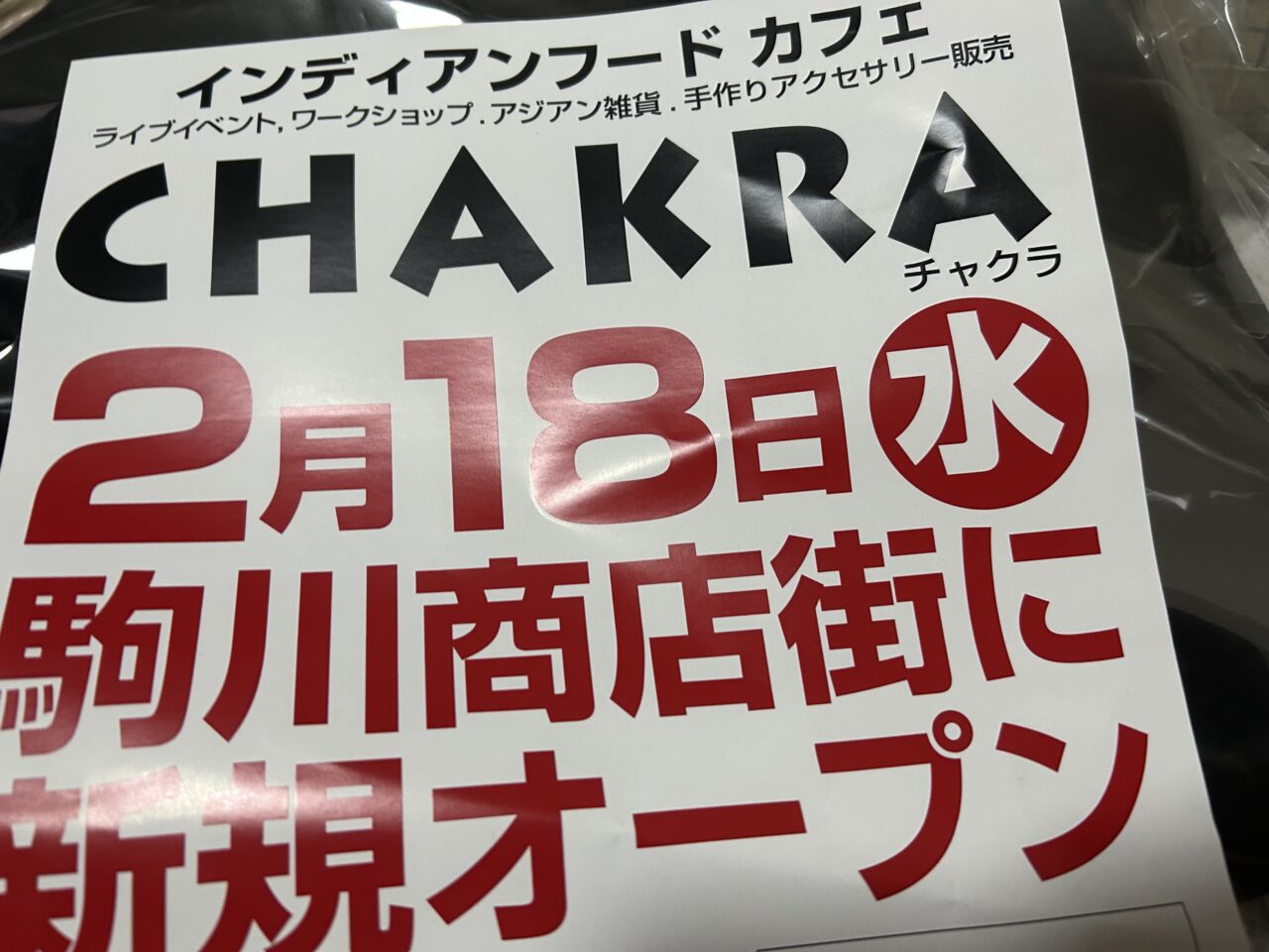 2026年2月18日(水)、駒川商店街に「インディアンフードカフェ CHAKRA(チャクラ)」が新規オープンしました。木目調の外観に大きく掲げられた“CHAKRA”の看板が目印で、商店街の中でもひときわ存在感を放っています。店頭にはオープンを知らせるポスターやハートのバルーンが飾られ、お祝いムードに包まれていました。