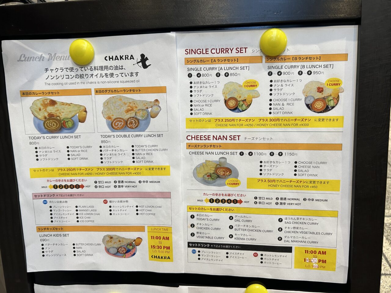 ランチタイムは11:00〜15:30(L.O.15:00)。カレーの種類はチキンカレーやバターチキンカレー、キーマカレー、ほうれん草チキンカレー、野菜カレー、ダールカレーなど豊富にラインナップ。辛さは甘口から激辛まで選べるため、辛いものが苦手な方でも安心です。ナンまたはライスが選べるセットに、サラダとソフトドリンクが付くお得なランチセットも用意されています。プラス料金でチーズナンやハニーチーズナンに変更できるのもうれしいポイントです。