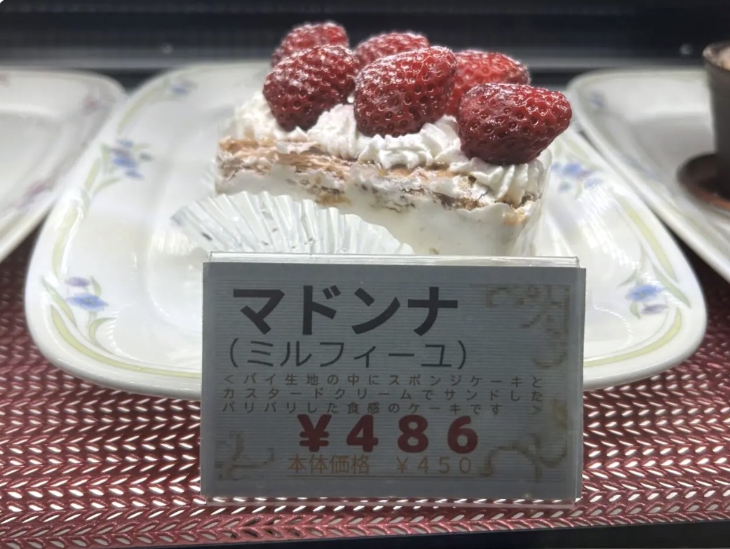 赤い外観が印象的なお店の中には、ショーケースいっぱいに彩り豊かなケーキが並び、訪れるだけでもワクワクする空間。定番のショートケーキからチョコレートケーキ、ミルフィーユなど、幅広いラインナップが揃っています。