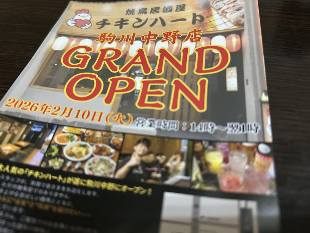 近鉄針中野駅そば駒川商店街に、新たな居酒屋がオープンしています。焼鳥居酒屋「チキンハート駒川中野店」が2026年2月10日(火)にグランドオープンしました。