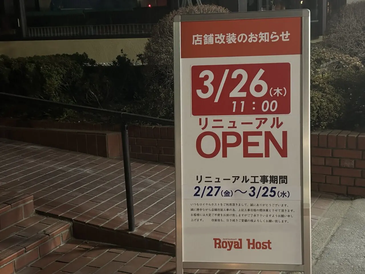 【大阪市住吉区】ロイヤルホスト帝塚山店が一時休業中!3月26日(水)11時リニューアルオープンへ