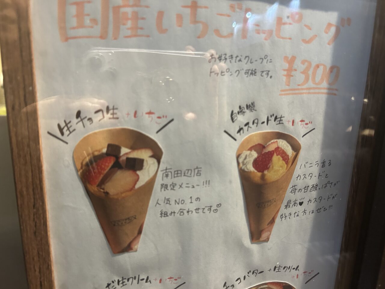 メニューはシンプルながらも魅力的で、「生チョコ生」「自家製カスタード生」など、定番ながらも間違いない組み合わせが揃っています。さらにトッピングで自分好みにカスタマイズできるのも楽しみのひとつで、何度訪れても新しい発見がありそうです。