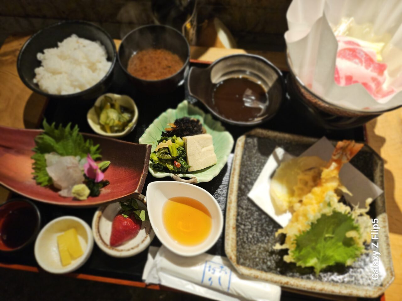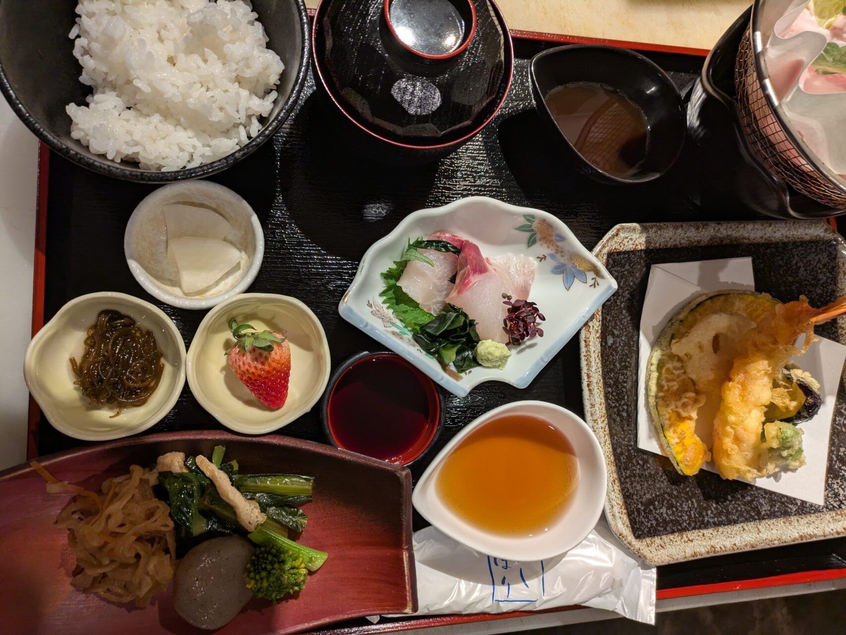 写真を見た瞬間に思わず「これはすごい…」と声が出るほどの豪華さ。天ぷらはサクサクの揚げたてで、海老や野菜などバランスよく盛り付けられています。さらにお刺身、小鉢、煮物、ご飯、汁物、デザートまで付いた充実の内容で、見た目にも楽しめる御膳です。
