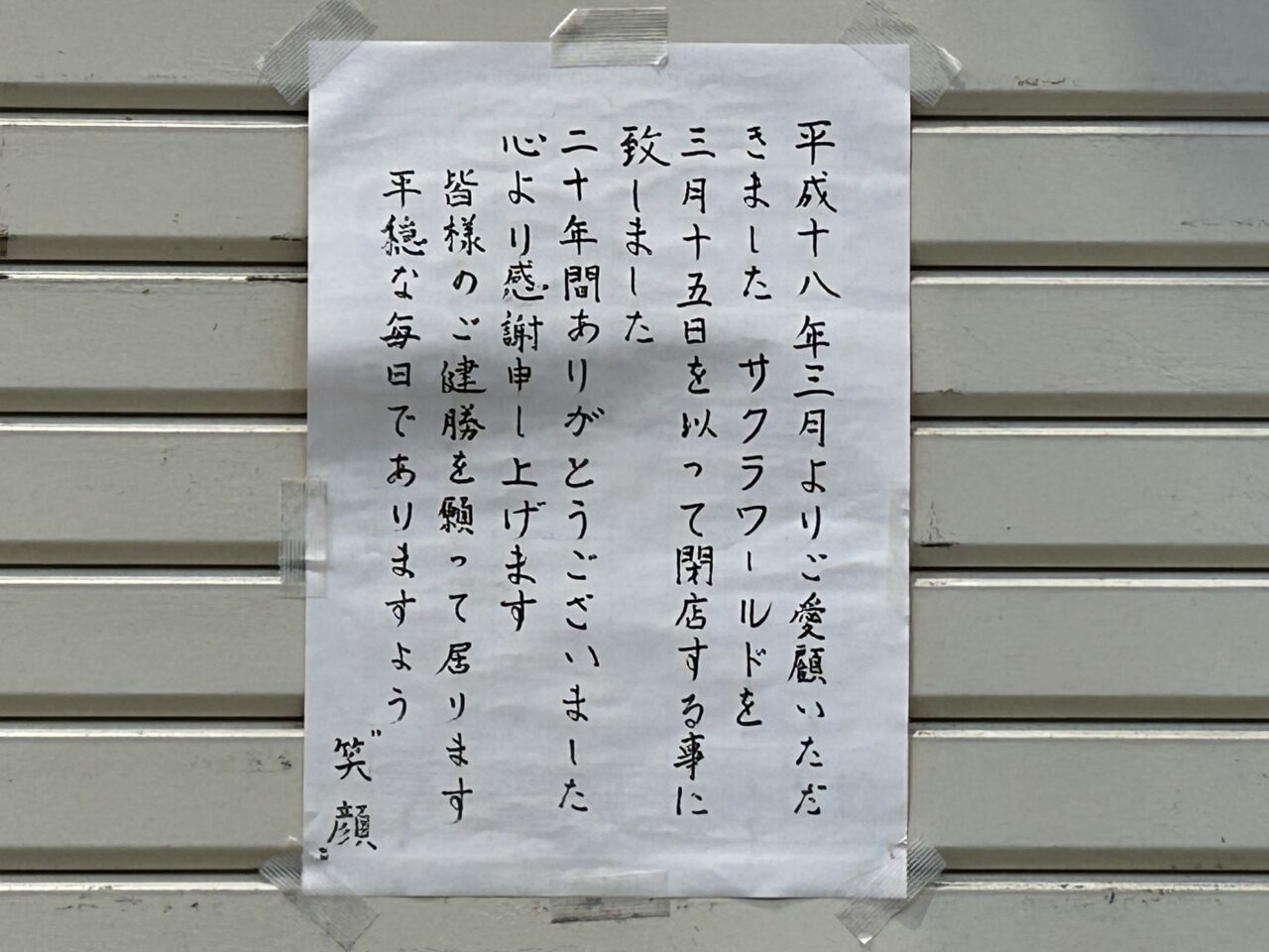 駒川商店街にある買取専門店「サクラワールド」が閉店していることがわかりました。現地を訪れると、店舗はすでにシャッターが閉まっており、入口には閉店を知らせる貼り紙が掲示されていました。貼り紙によると、平成18年(2006年)3月より営業を続けてきたサクラワールドは、令和8年(2026年)3月15日をもって閉店されたとのことです。長年にわたり地域の方々に利用されてきたお店で、「20年間ありがとうございました」「皆様のご健勝を願っております」といった感謝の言葉が丁寧に綴られていました。