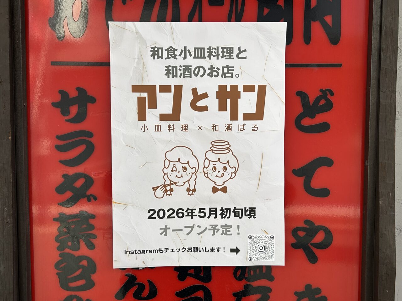 掲示によると、こちらには小皿料理と和酒を楽しめるお店「アンとサン」が、2026年5月初旬頃にオープン予定とのことです。「和食小皿料理と和酒のお店」と大きく書かれており、落ち着いた雰囲気の中で食事やお酒が楽しめそうな印象を受けました。