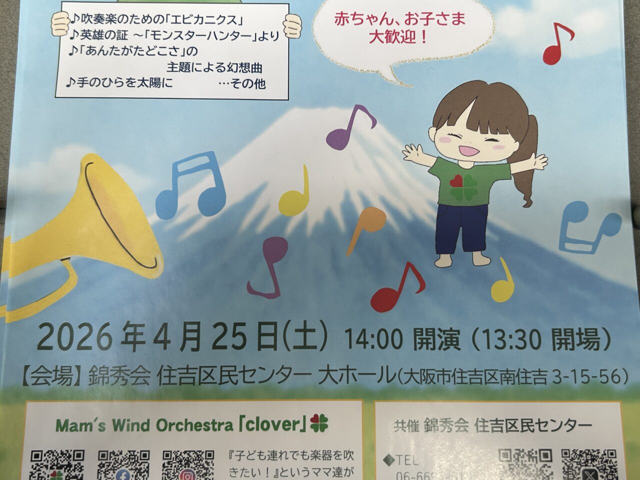2026年4月25日(土)、住吉区民センター大ホールにて「ドレミコンサート2026」が開催されます。大阪のママさん吹奏楽団「Mam’s Wind Orchestra『clover』」による演奏会で、赤ちゃんや小さなお子さまも大歓迎という、家族で楽しめる貴重なコンサートです。