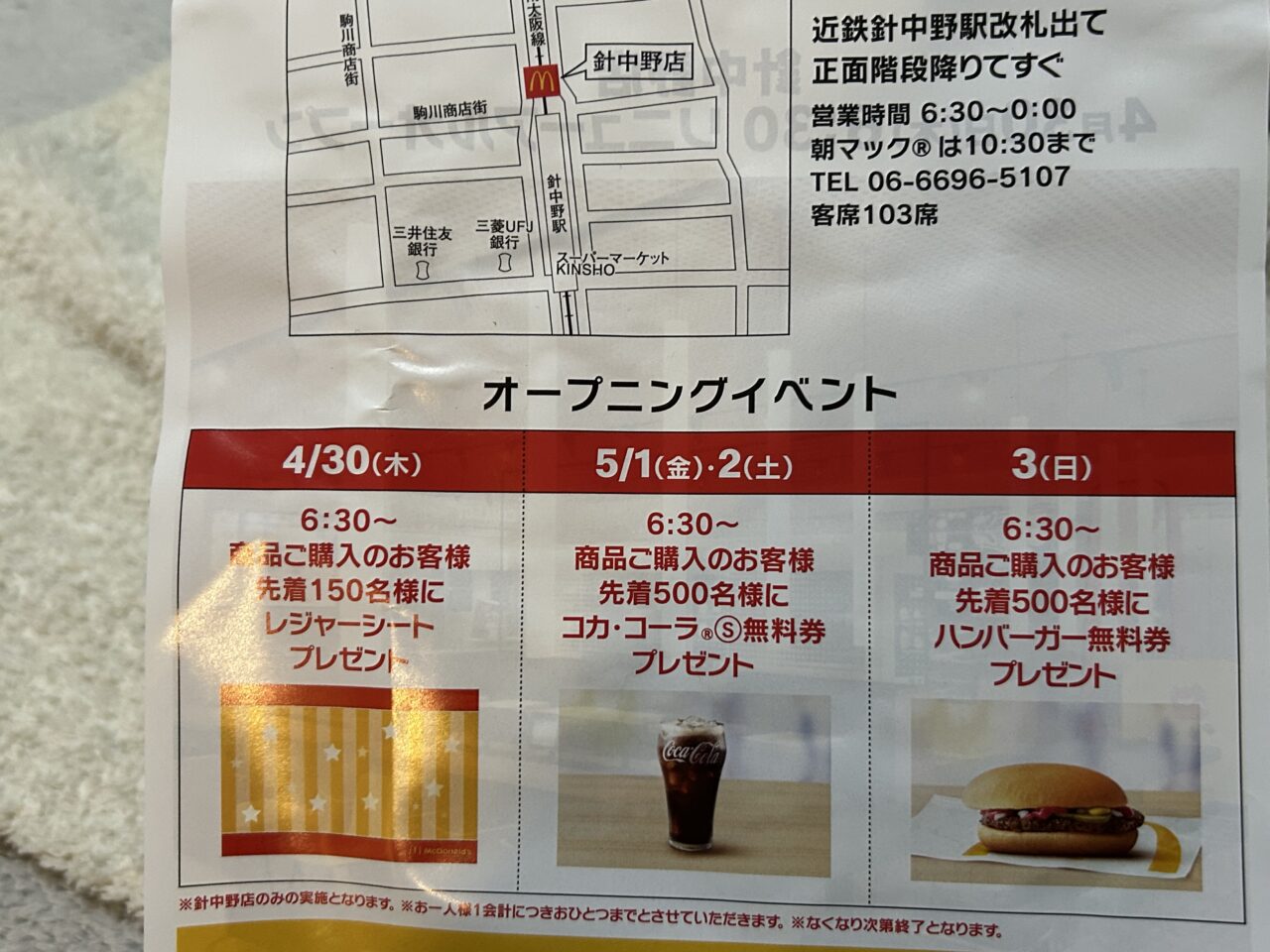 【大阪市東住吉区】無料券がもらえるチャンス!マクドナルド針中野店が4月30日(木)朝6:30リニューアルオープン