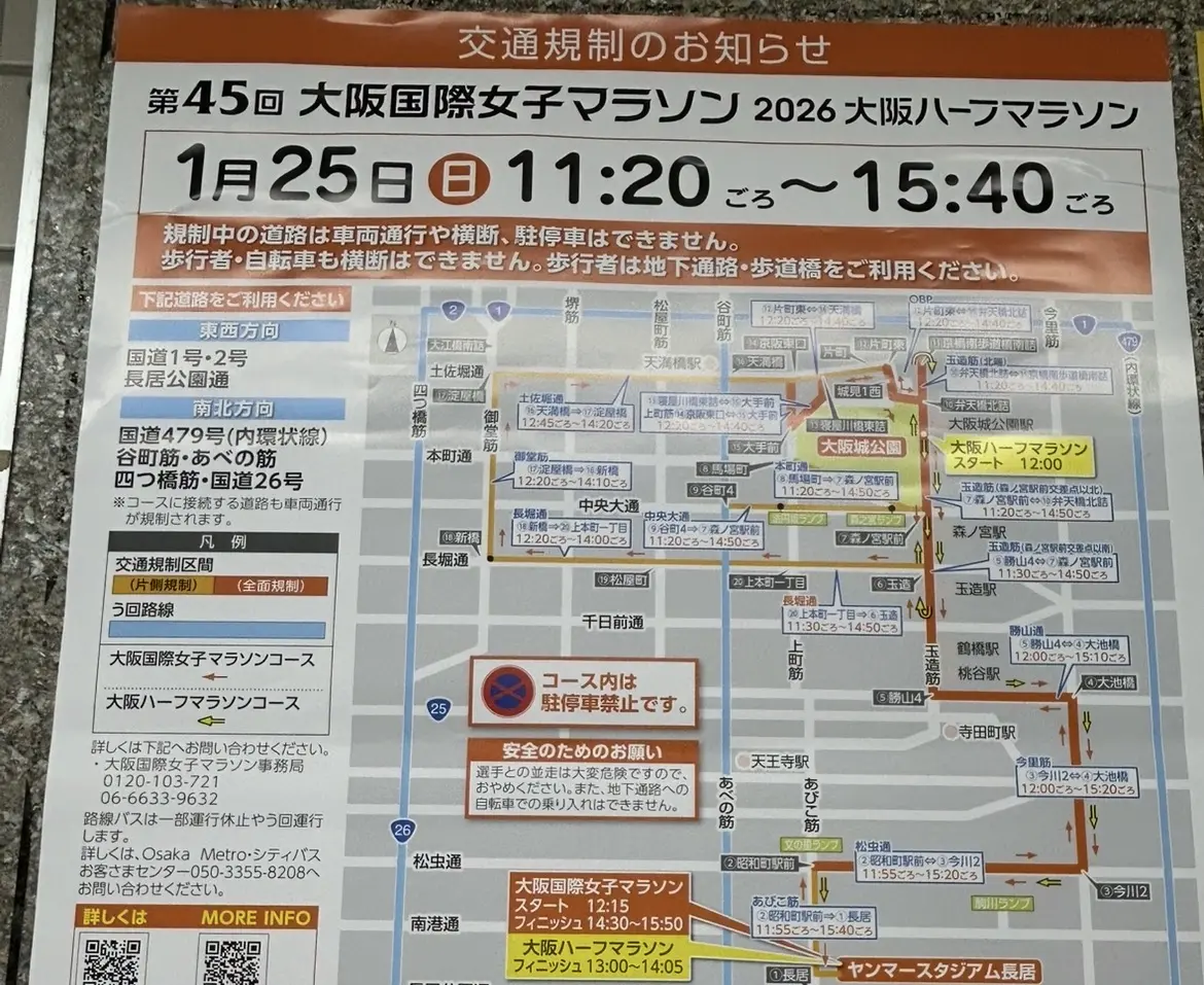 また本日は、長居周辺を中心に大規模な交通規制が実施されます。長居公園周辺道路では時間帯によって通行止めや進入禁止となる区間があり、バスの運行ルート変更や遅れが発生する可能性もあります。お出かけを予定されている方は、事前に交通情報を確認し、時間に余裕をもった行動がおすすめです。世界レベルの大会を支える一日として、東住吉区一帯がマラソン一色に染まります。